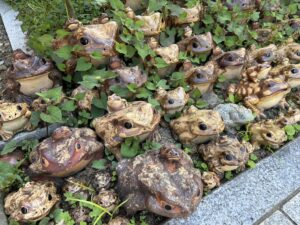 ふと地面に目をやると、カエルの置物がいっぱい!!